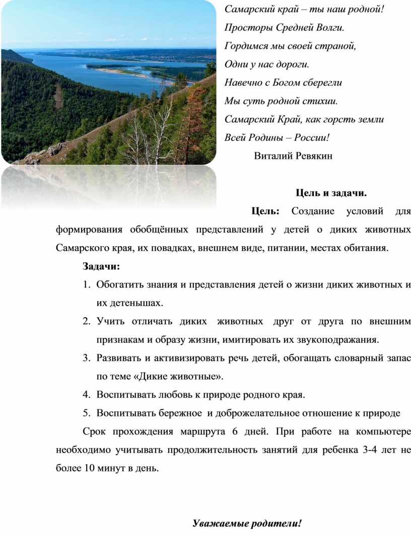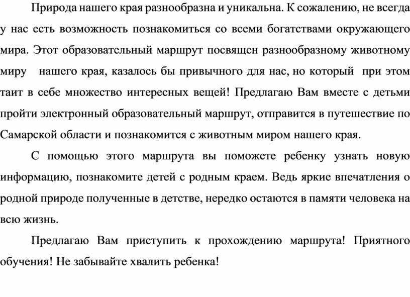 Природа нашего края разнообразна и уникальна. К сожалению, не всегда у нас есть возможность познакомиться со всеми богатствами окружающего мира. Этот образовательный маршрут посвящен разнообразному животному миру нашего края, казалось бы привычного для нас, но который при этом таит в себе множество интересных вещей! Предлагаю Вам вместе с детьми пройти электронный образовательный маршрут, отправится в путешествие по Самарской области и познакомится с животным миром нашего края.