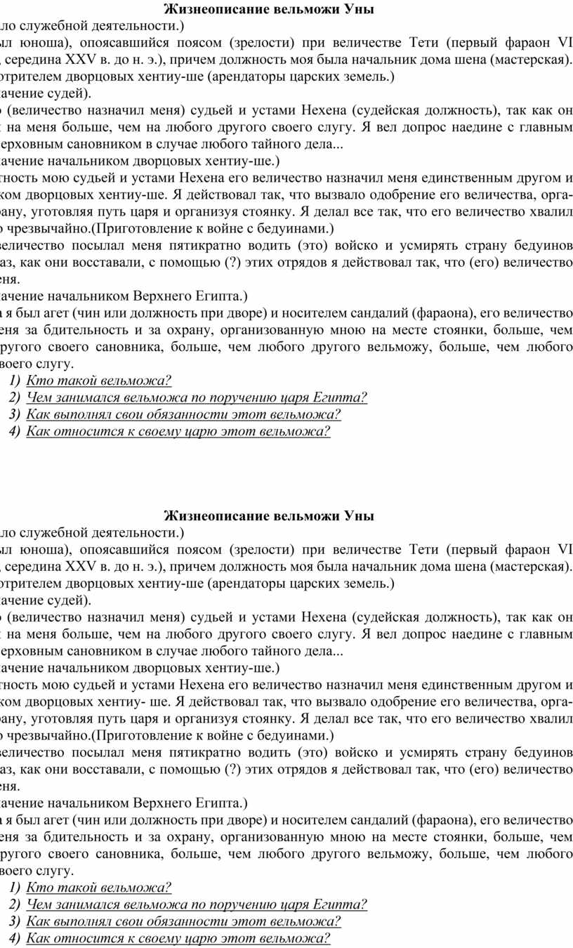 (Я был юноша), опоясавшийся поясом (зрелости) при величестве Тети (первый фараон VI династии, середина XXV в. до н. э.), причем должность моя была начальник дома шена (мастерская). Я был смотрителем дворцовых хентиу-ше (арендаторы царских земель.)