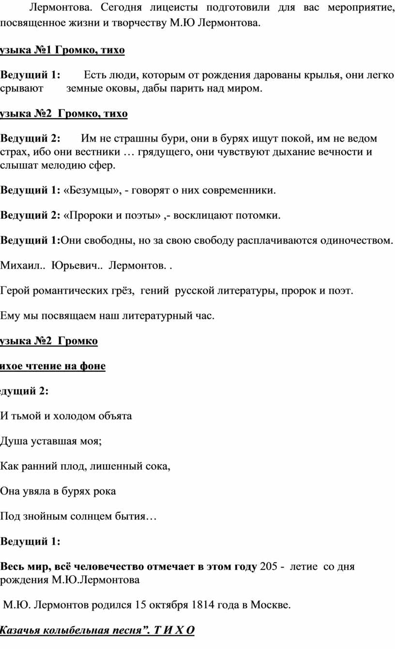 Именем М.Ю. Лермонтова открывается новая страница русской литературы. Судьба и поэзия Лермонтова овеяны глубоким трагизмом. Жизнь его была коротка, но ослепительна. В произведениях Лермонтова можно прочесть историю его души и понять его не только как поэта, но и как человека. Поэзия Лермонтова удивительно созвучна нашему времени: наполнена чувством гражданского долга, свободы и справедливости, любовью к родине. В этом году исполняется 205 лет со дня рождения Михаила Юрьевича Лермонтова. Сегодня лицеисты подготовили для вас мероприятие, посвященное жизни и творчеству М.Ю Лермонтова.