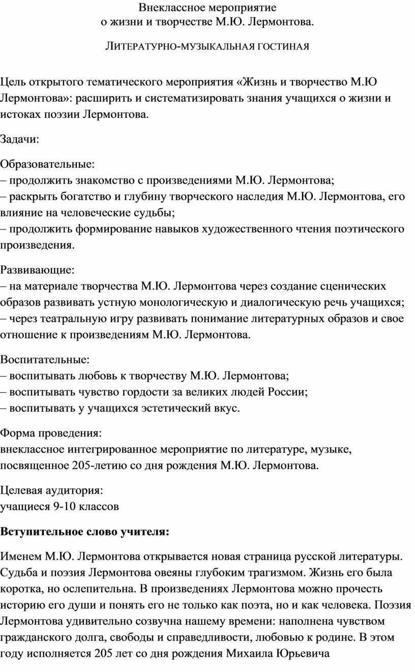 – раскрыть богатство и глубину творческого наследия М.Ю. Лермонтова, его