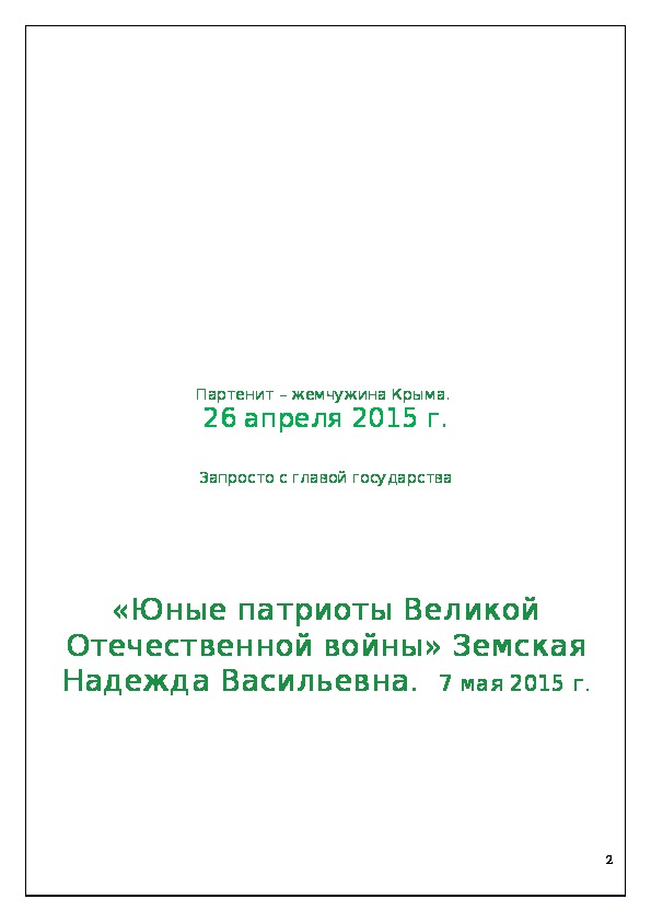 «Юные патриоты Великой Отечественной войны» Земская Надежда Васильевна. 7 мая 2015 г.