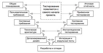 18. V-образная модель делает особый акцент на тестировании. Как в ней организована связь между этапами разработки и этапами тестирования?