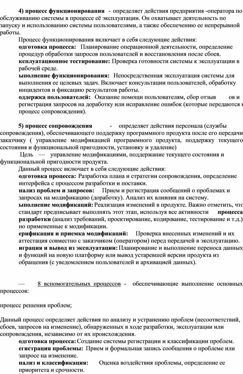 5) процесс сопровождения - определяет действия персонала (службы сопровождения), обеспечивающего поддержку программного продукта после его передачи заказчику ( управление модификацией программного продукта, поддержку текущего состояния и функциональной пригодности, установку и удаление)