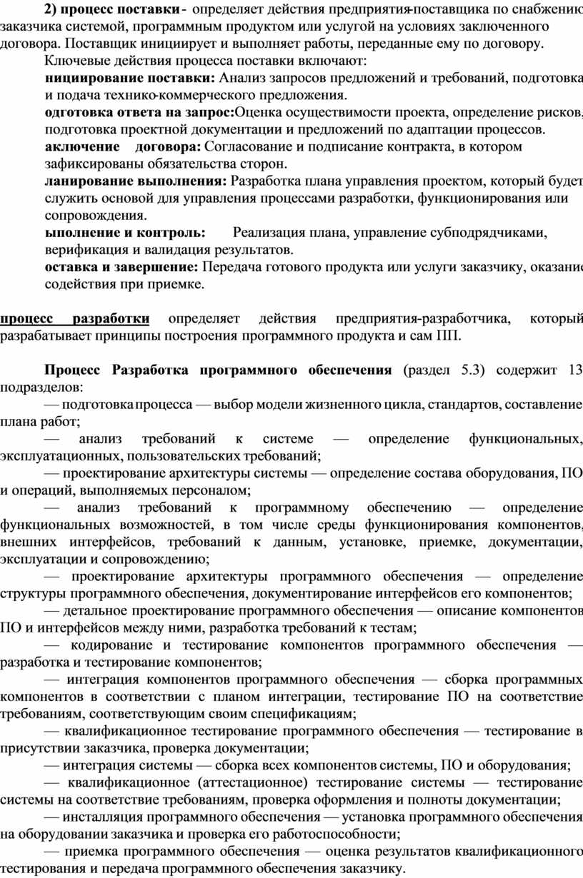 2) процесс поставки - определяет действия предприятия-поставщика по снабжению заказчика системой, программным продуктом или услугой на условиях заключенного договора. Поставщик инициирует и выполняет работы, переданные ему по договору.