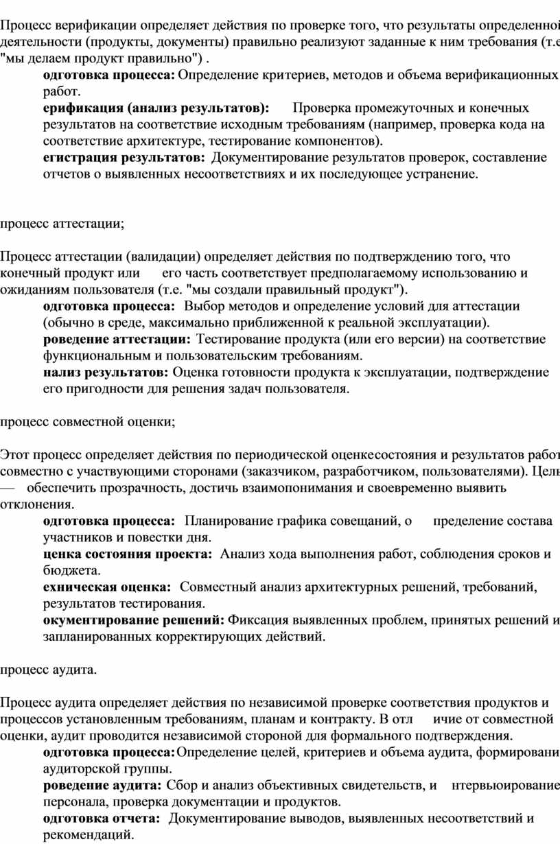 Процесс верификации определяет действия по проверке того, что результаты определенной деятельности (продукты, документы) правильно реализуют заданные к ним требования (т.е. "мы делаем продукт правильно") .