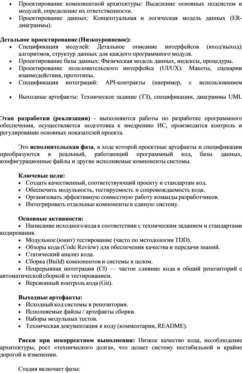 — детальное проектирование программного обеспечения — описание компонентов ПО и интерфейсов между ними, разработка требований к тестам;