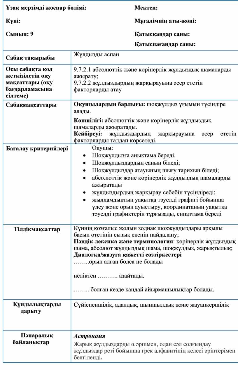 Күннің қозғалыс жолын зодиак шоқжұлдыздары арқылы басып өтетінін сызық екенін пайдалану; Пәндік лексика және терминология: көрінерлік жұлдыздық шама, абсолют жұлдыздық шама, шоқжұлдыз, жарықтылық; Диалогқа/жазуға қажетті сөзтіркестері ……..орын алған болса не болады