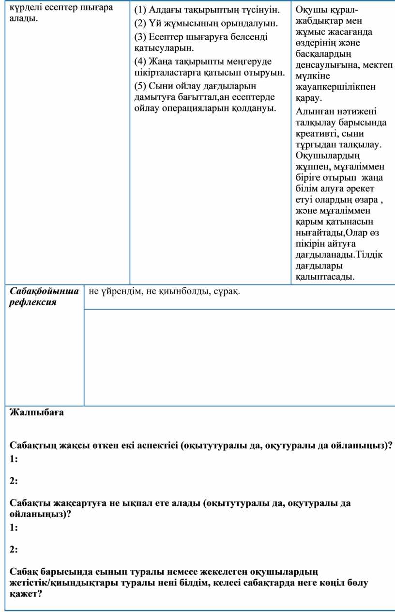 Барлықоқушылар: Бүгінгі игерген материалдар келесі сабақтардың негізі болатындықтан, тақырып бойынша теориялық білімдерін барлық оқушыда қалыптастыру. Оқушылардың басым бөлігі: тақырыпты түсінеді, тақырыптың есептерін шығаруға белсенді қатысады. Қабілетті оқушыларға берілген тапсырма: күрделі есептер шығара алады. |