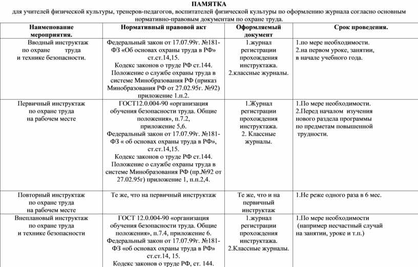 для учителей физической культуры, тренеров-педагогов, воспитателей физической культуры по оформлению журнала согласно основным нормативно-правовым документам по охране труда.