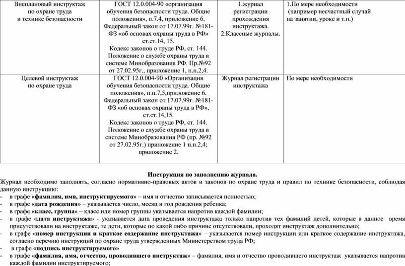 ГОСТ 12.0.004-90 «организация обучения безопасности труда. Общие положения», п.7.4, приложение 6. Федеральный закон от 17.07.99г. №181-ФЗ «об основах охраны труда в РФ» ст.ст.14, 15. Кодекс законов о труде РФ, ст. 144. Положение о службе охраны труда в системе Минобразования РФ. Пр.№92 от 27.02.95г., приложение 1, п.п.2,4. |