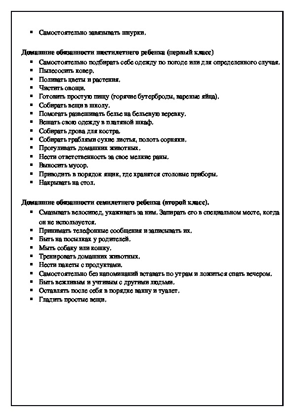 Домашние обязанности шестилетнего ребенка (первый класс)