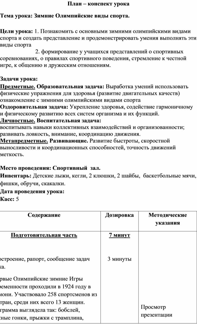 Цели урока: 1. Познакомить с основными зимними олимпийскими видами спорта и создать представление и продемонстрировать умения выполнять эти виды спорта