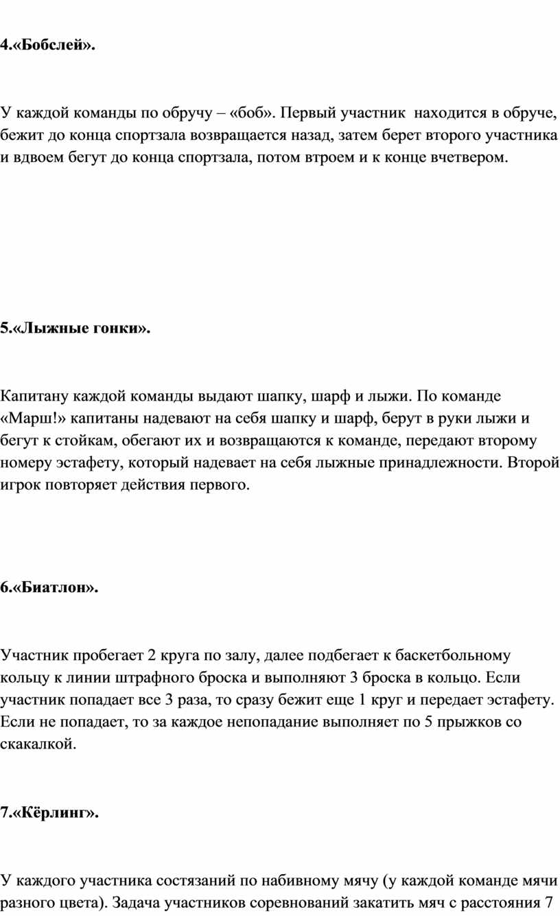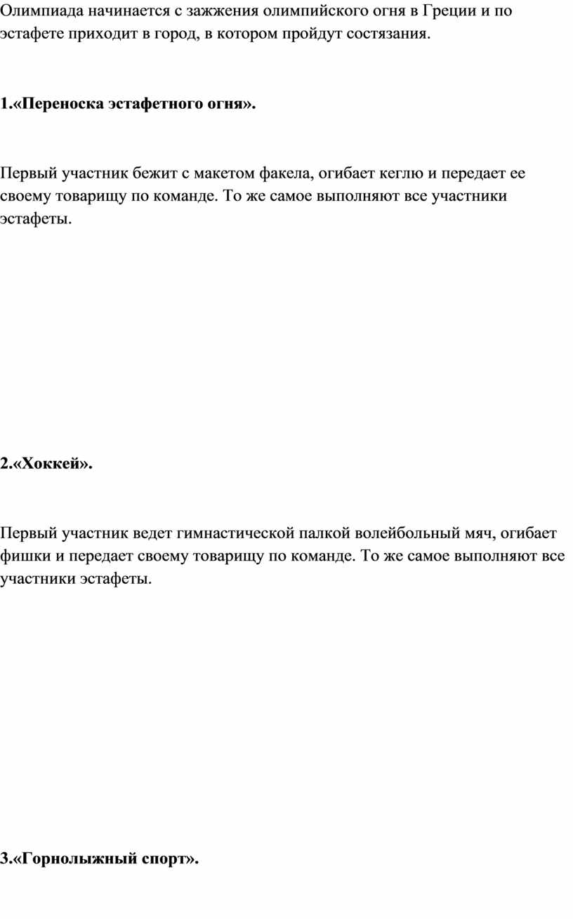 Класс делится на две равных команды. Команды занимают свои места для начала эстафет. Учитель: Сегодня мы с вами проводим эстафеты с элементами зимних олимпийских видов спорта. Олимпиада начинается с зажжения олимпийского огня в Греции и по эстафете приходит в город, в котором пройдут состязания.