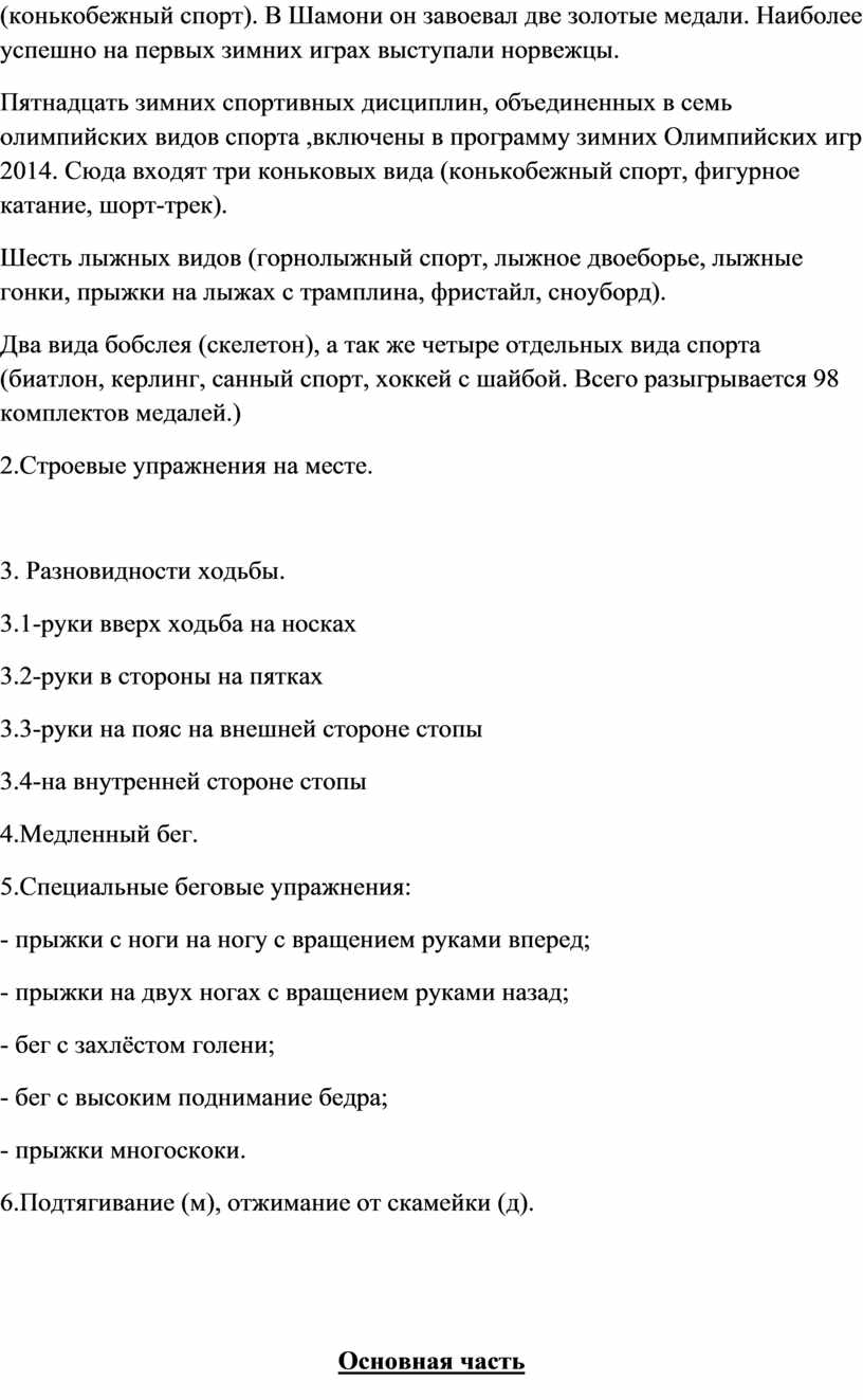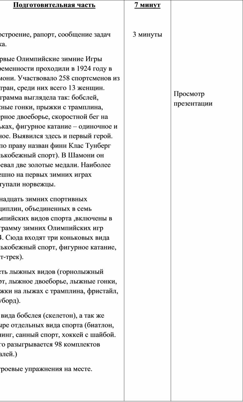 1.Построение, рапорт, сообщение задач урока. Первые Олимпийские зимние Игры современности проходили в 1924 году в Шамони. Участвовало 258 спортсменов из 16 стран, среди них всего 13 женщин. Программа выглядела так: бобслей, лыжные гонки, прыжки с трамплина, северное двоеборье, скоростной бег на коньках, фигурное катание – одиночное и парное. Выявился здесь и первый герой. Им по праву назван финн Клас Тунберг (конькобежный спорт). В Шамони он завоевал две золотые медали. Наиболее успешно на первых зимних играх выступали норвежцы. Пятнадцать зимних спортивных дисциплин, объединенных в семь олимпийских видов спорта ,включены в программу зимних Олимпийских игр 2014. Сюда входят три коньковых вида (конькобежный спорт, фигурное катание, шорт-трек). Шесть лыжных видов (горнолыжный спорт, лыжное двоеборье, лыжные гонки, прыжки на лыжах с трамплина, фристайл, сноуборд). Два вида бобслея (скелетон), а так же четыре отдельных вида спорта (биатлон, керлинг, санный спорт, хоккей с шайбой. Всего разыгрывается 98 комплектов медалей.) 2.Строевые упражнения на месте.