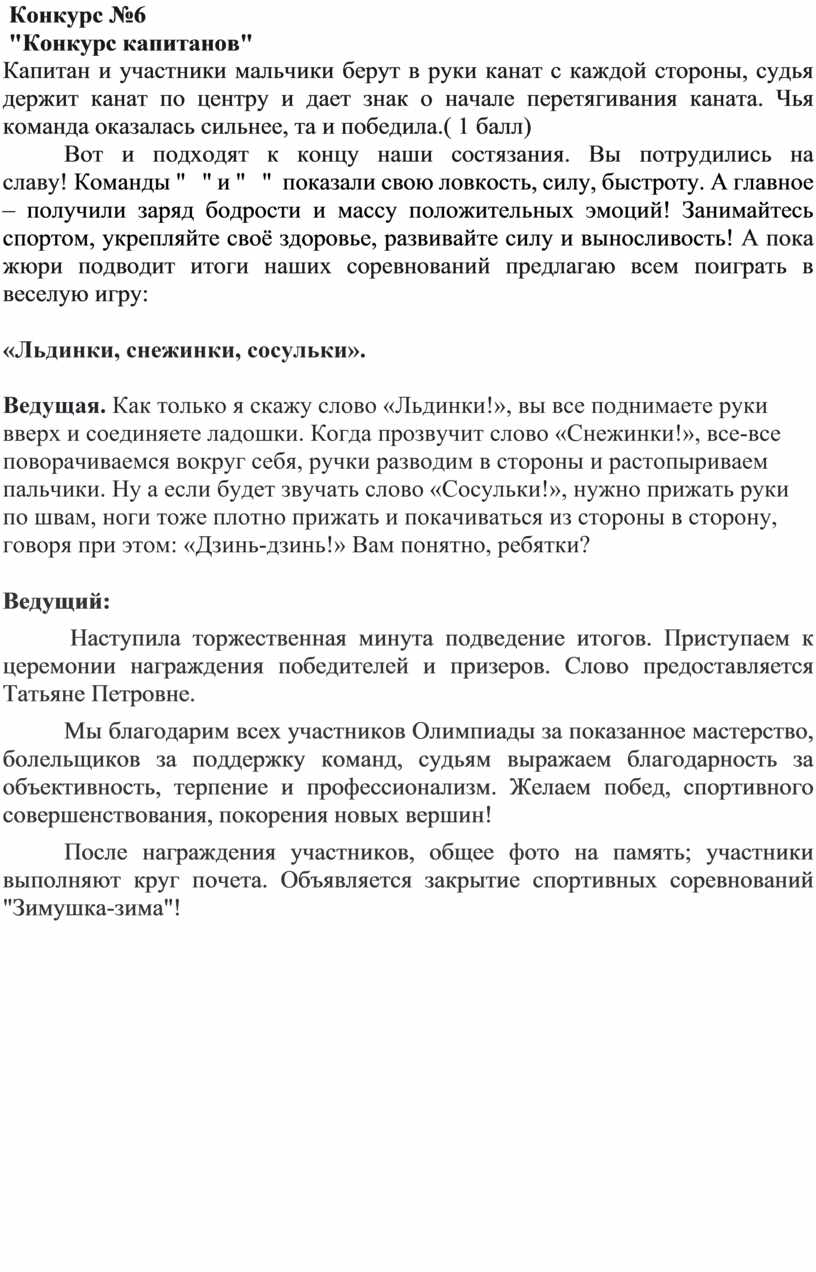 Капитан и участники мальчики берут в руки канат с каждой стороны, судья держит канат по центру и дает знак о начале перетягивания каната. Чья команда оказалась сильнее, та и победила.( 1 балл)