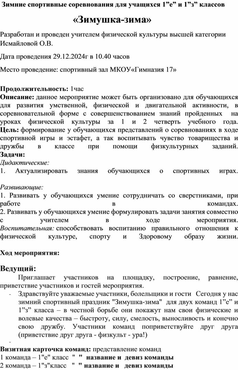 - Здравствуйте уважаемые участники, болельщики и гости Сегодня у нас зимний спортивный праздник "Зимушка-зима" для двух команд 1”е” и 1”з” класса – в честной борьбе они покажут нам свои физические и волевые качества – быстроту, силу, смелость, выносливость и конечно свою дружбу. Участники команд поприветствуйте друг друга (приветствие друг друга - физкульт - ура!)