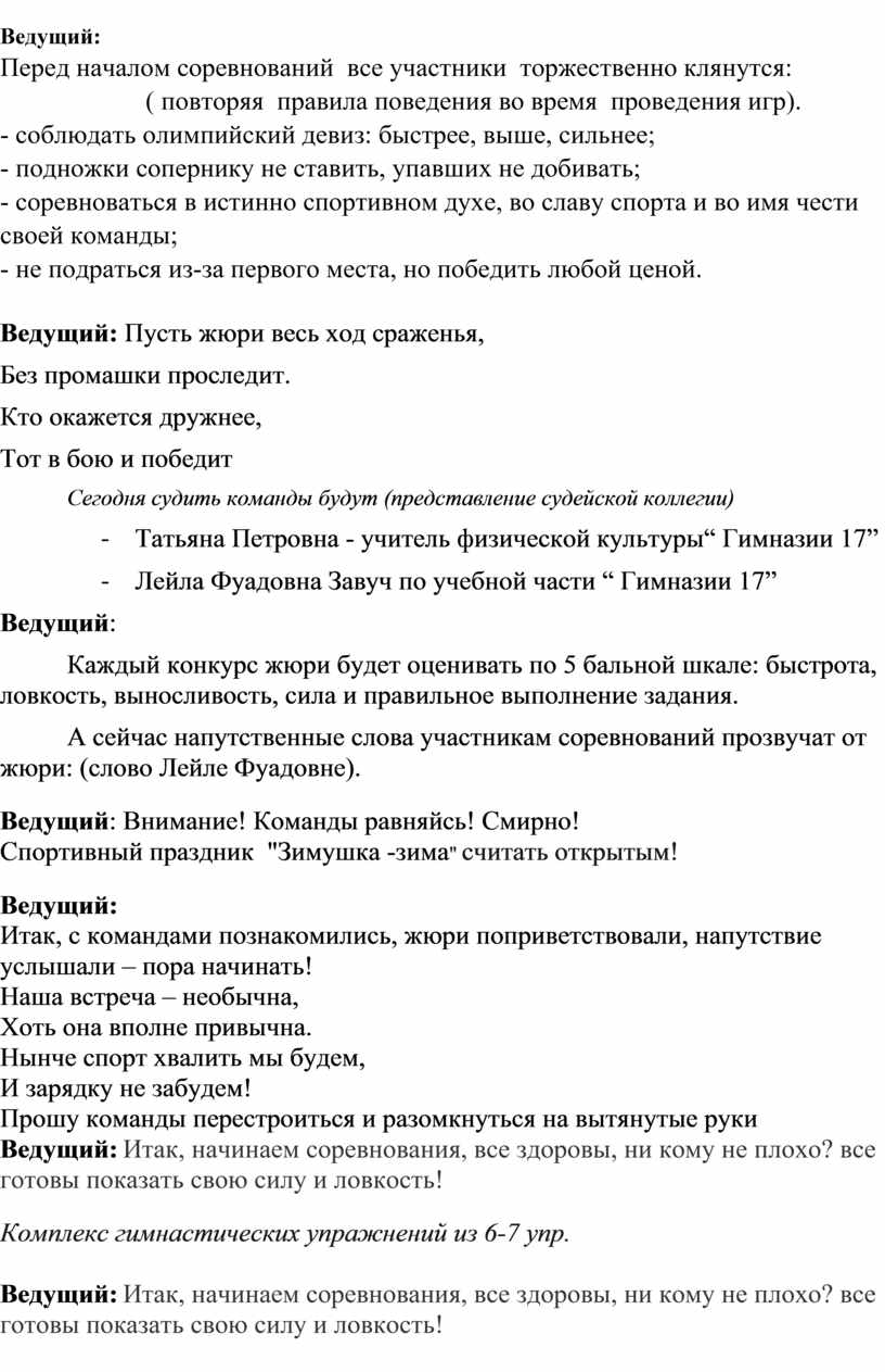 Ведущий: Перед началом соревнований все участники торжественно клянутся: