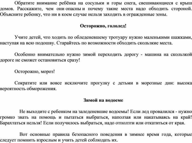 Вот основные правила безопасного поведения в зимнее время года, которые следует помнить взрослым и учить детей соблюдать их.