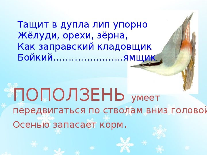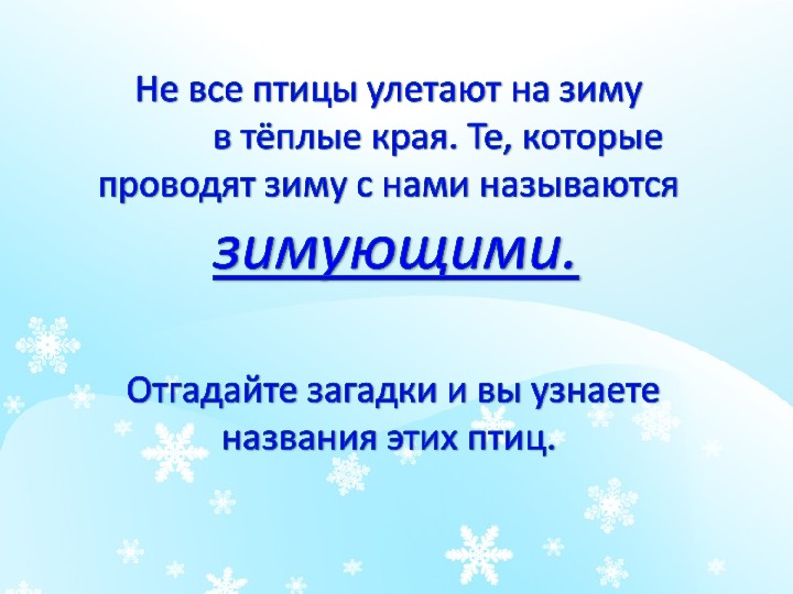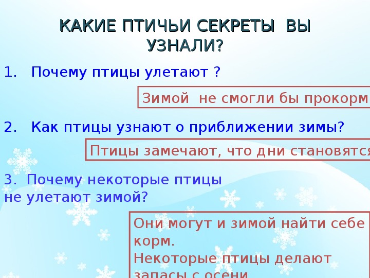 • Приводить примеры перелетных и зимующих птиц.Зимующие птицы. Птичьи секреты