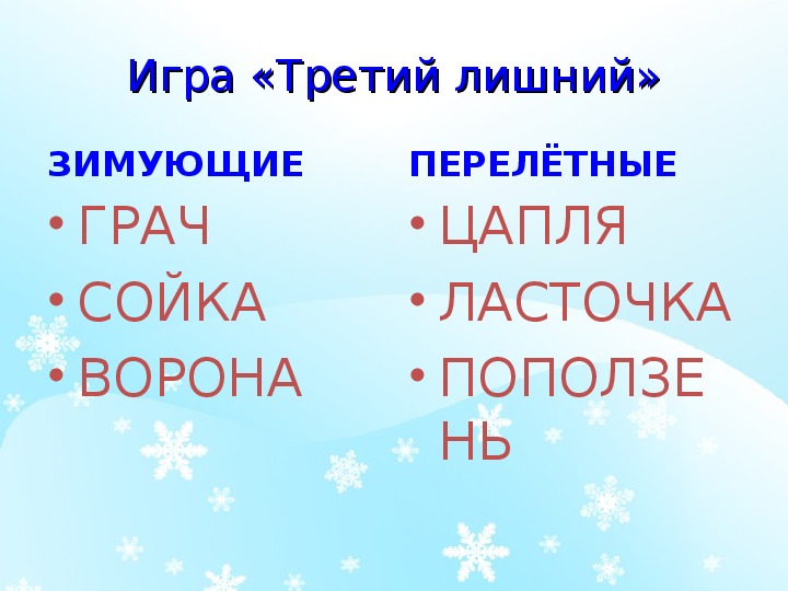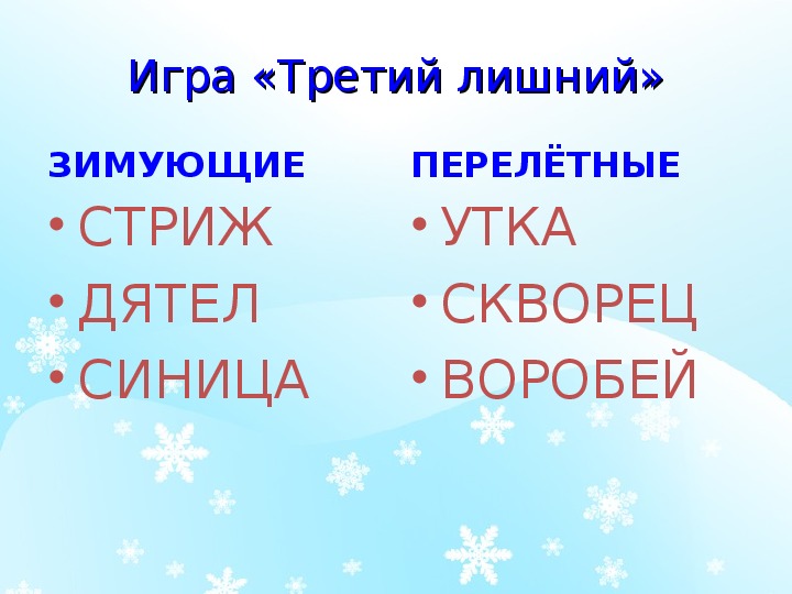 • Различать перелетных и зимующих птиц;