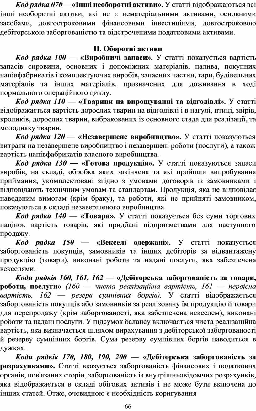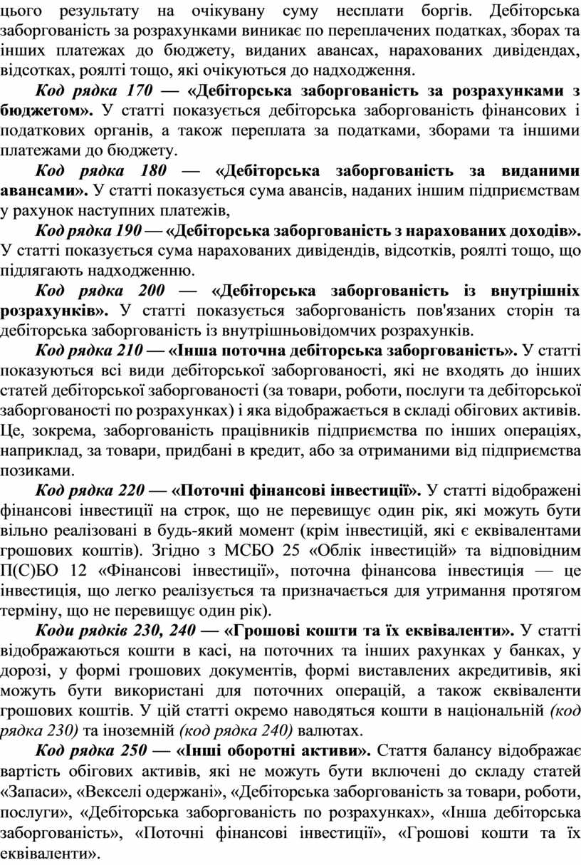 Коди рядків 170, 180, 190, 200 — «Дебіторська заборгованість за розрахунками». Статті вказується заборгованість фінансових і податкових органів, пов'язаних сторін, заборгованість із внутрішньовідомчих розрахунків, яка відображається в складі обігових активів і не може бути включена до інших статей. Отже, очевидною є необхідність коригування