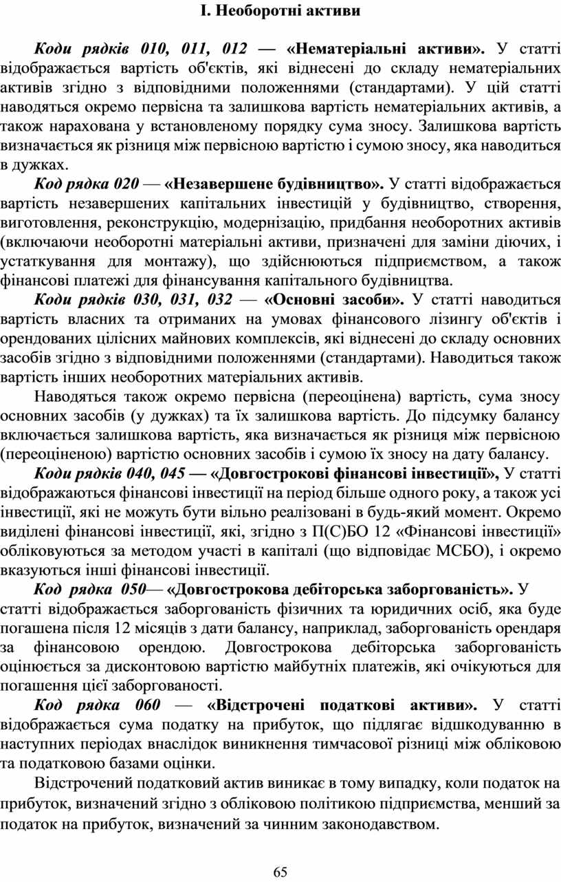 Коди рядків 010, 011, 012 — «Нематеріальні активи». У статті відображається вартість об'єктів, які віднесені до складу нематеріальних активів згідно з відповідними положеннями (стандартами). У цій статті наводяться окремо первісна та залишкова вартість нематеріальних активів, а також нарахована у встановленому порядку сума зносу. Залишкова вартість визначається як різниця між первісною вартістю і сумою зносу, яка наводиться в дужках.