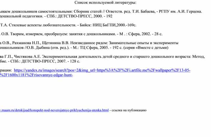 5.Тугушева Г.П., Чистякова А.Е. Экспериментальная деятельность детей среднего и старшего дошкольного возраста: Метод, пособие. - СПб.: ДЕТСТВО-ПРЕСС, 2007. - 128 с.