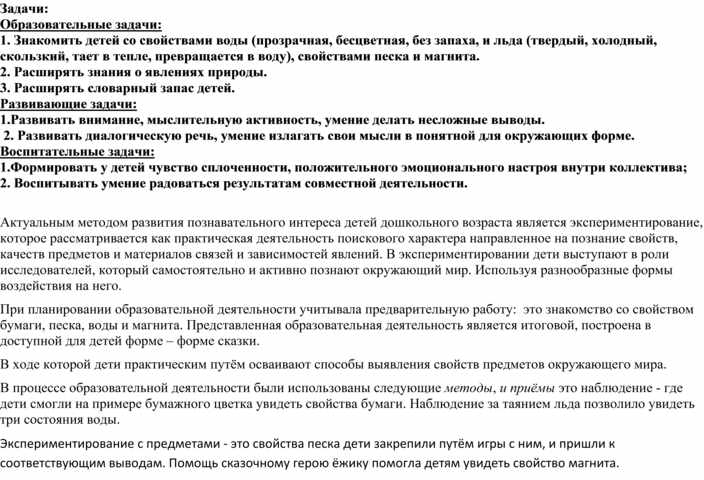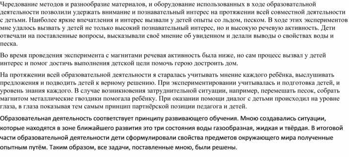 Образовательная деятельность соответствует принципу развивающего обучения. Мною создавались ситуации, которые находятся в зоне ближайшего развития это три состояния воды газообразная, жидкая и твёрдая. В итоговой части образовательной деятельности дети сформулировали свойства предметов окружающего мира полученные опытным путём. Таким образом, все задачи, поставленные мною, были решены.