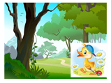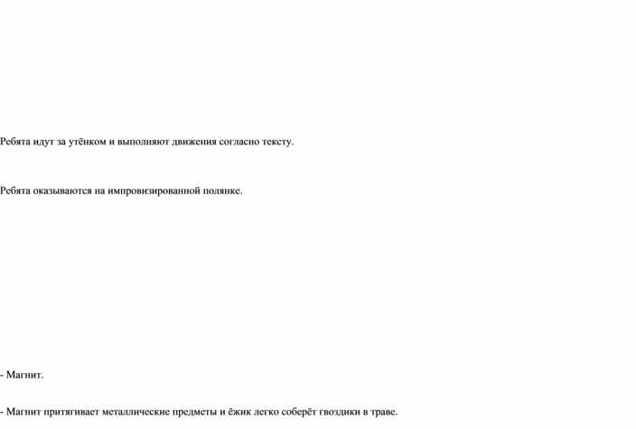 - Что за звуки? Мы попали в ту сказку, которую я хочу вам рассказать. - И так! На одном птичьем дворе у мамы-утки вылупились утята. Все детки были послушные и всегда ходили за мамой-уткой, только один был уж очень любопытный. Утенок везде совал свой нос и задавал очень много вопросов. Устав отвечать на постоянные вопросы утёнка: - когда, зачем, где, почему? -, мама-утка просто перестала обращать на него внимание . Утенку всегда хотелось узнать, что там, за забором птичьего двора? И вот, однажды в один прекрасный день через дырку в заборе утенок отправился исследовать мир. -Пойдёмте за утенком, а то вдруг он один заблудится. Может мы сможем ему помочь. Мы шагаем друг за другом. Лесом и зелёным лугом. Крылья пёстрые мелькают – это бабочки летают. 1, 2, 3, 4 –полетели, закружились. Утенок кружился вместе с бабочками, которые перелетали с цветка на цветок и незаметно для себя оказался на лесной полянке. Там он увидел Ёжика, который возился в траве. А в лапках он держал какой - то странный и незнакомый утенок предмет. - Здравствуй, Ёжик! - А что за странный предмет ты держишь в своих лапках? - Этот предмет, поможет мне собрать, то что я просыпал – ответил Ёжик. Я должен успеть - до начала дождя починить крышу на своем домике. И если вы мне поможете, я буду вам очень благодарен. - Ха-ха-ха засмеялся утенок. Как же этот предмет сможет собрать то что ты рассыпал в траве. - Ребята, а вы знаете, что за предмет держит Ёжик? - И как же магнит справится с такой трудной задачей, ведь трава такая высокая?