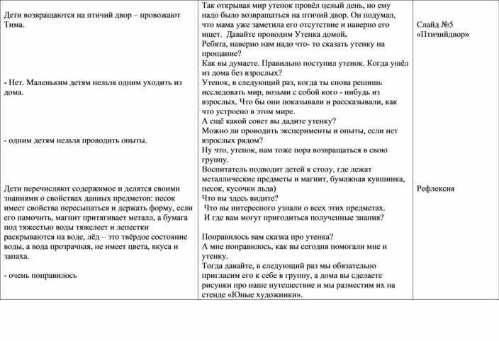 Так открывая мир утенок провёл целый день, но ему надо было возвращаться на птичий двор. Он подумал, что мама уже заметила его отсутствие и наверно его ищет. Давайте проводим Утенка домой. Ребята, наверно нам надо что- то сказать утенку на прощание? Как вы думаете. Правильно поступил утенок. Когда ушёл из дома без взрослых? Утенок, в следующий раз, когда ты снова решишь исследовать мир, возьми с собой кого - нибудь из взрослых. Что бы они показывали и рассказывали, как что устроено в этом мире. А ещё какой совет вы дадите утенку? Можно ли проводить эксперименты и опыты, если нет взрослых рядом? Ну что, утенок, нам тоже пора возвращаться в свою группу. Воспитатель подводит детей к столу, где лежат металлические предметы и магнит, бумажная кувшинка, песок, кусочки льда) Что вы здесь видите? Что вы интересного узнали о всех этих предметах. И где вам могут пригодиться полученные знания?