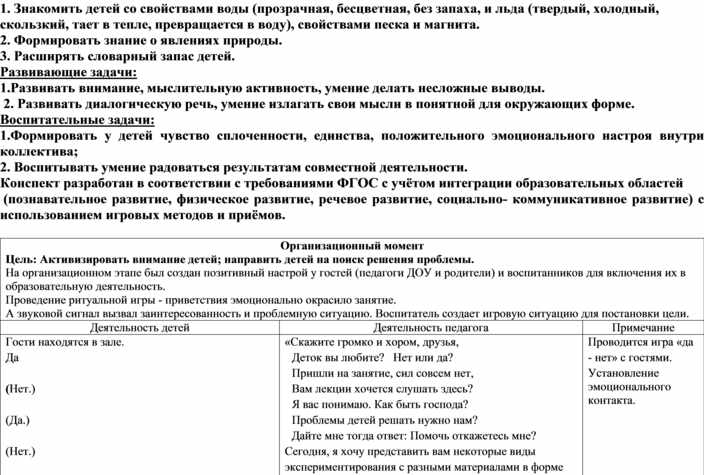 1. Знакомить детей со свойствами воды (прозрачная, бесцветная, без запаха, и льда (твердый, холодный, скользкий, тает в тепле, превращается в воду), свойствами песка и магнита.