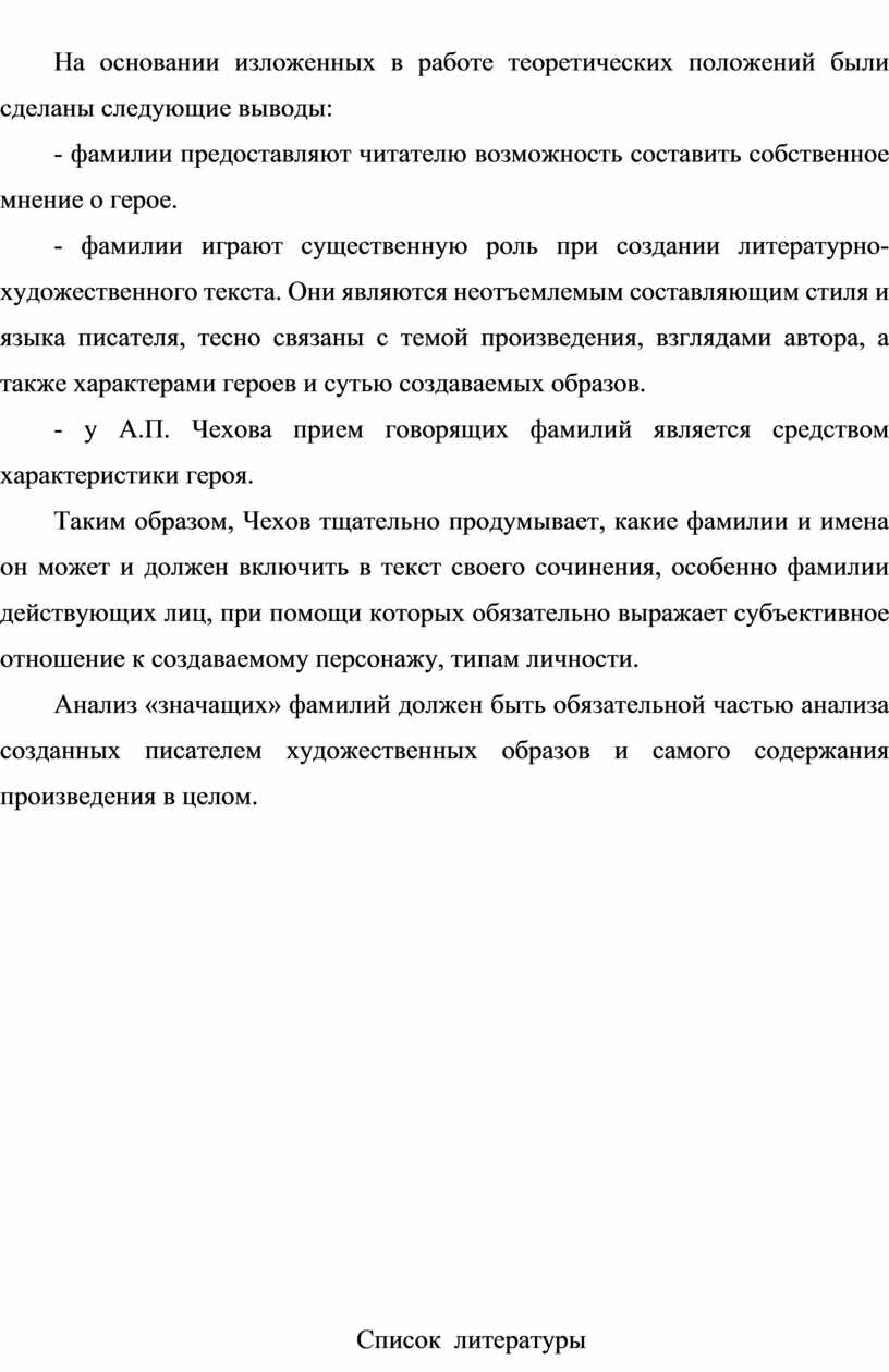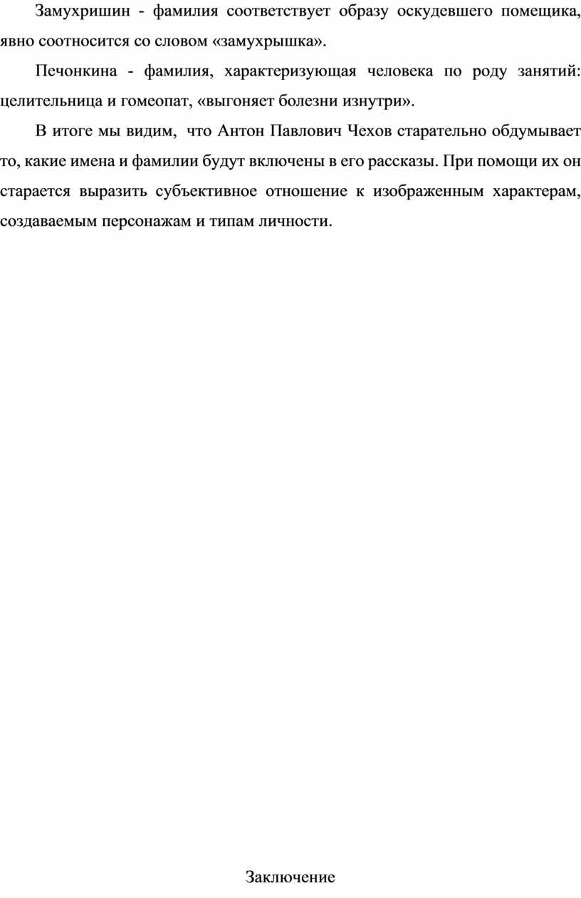 В итоге мы видим, что Антон Павлович Чехов старательно обдумывает то, какие имена и фамилии будут включены в его рассказы. При помощи их он старается выразить субъективное отношение к изображенным характерам, создаваемым персонажам и типам личности.