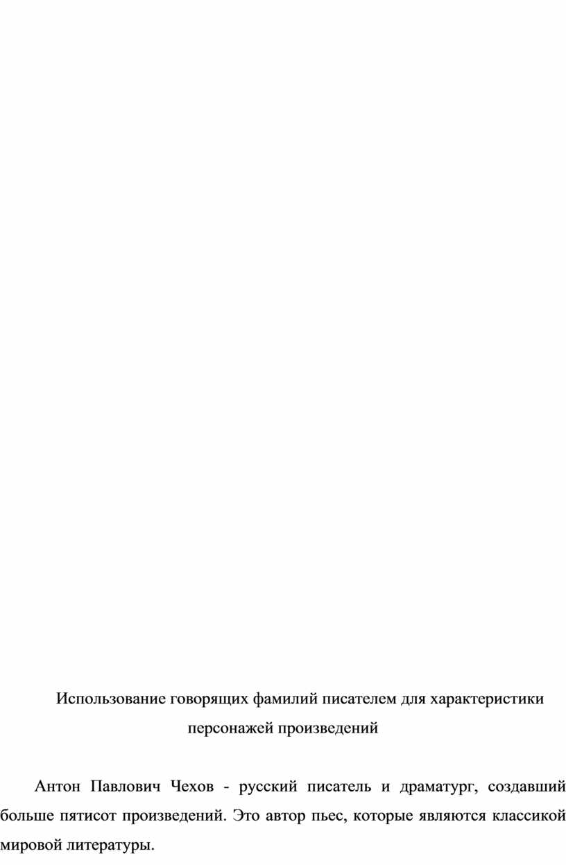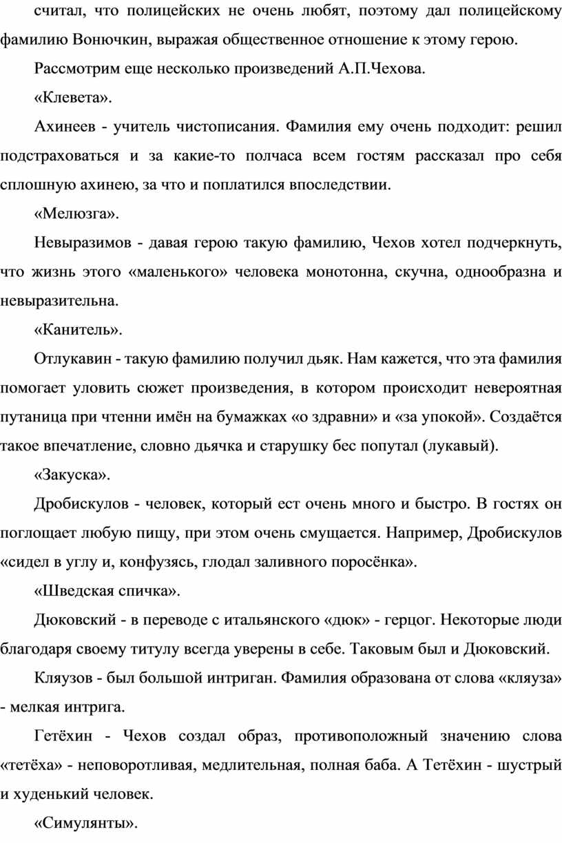 А. П. Чехов начал своё творчество с маленьких смешных рассказов. Несмотря на небольшой объем этих произведений и смешные ситуации, они говорили о серьёзных вещах и заставляли подумать о себе и своих поступках. Героями рассказов были обычные люди, часто неумные и пошлые. Чехов был убеждён, что «тогда человек станет лучше, когда вы покажете ему, каков он есть». «Пошлые люди не видят своих пороков, более того, они считают себя нормальными и даже хорошими людьми». Чехов был одним из первых наших писателей, кто понял, что деньги, чин, авторитет, поклонение им порождает страх, порабощающий и уничтожающий человека. За человека гордого, свободного, имеющего чувство собственного достоинства, боролся Чехов в своих рассказах. Всем своим творчеством писатель утверждал прекрасное в жизни, протестуя против невежества, нищеты духа и быта. Несмотря на кажущуюся простоту, рассказы были приняты как серьёзноё произведение, критикующее режим в России конца 19 столетия. Чехов-мастер художественных приёмов. Одним из удачнейших, писатель считал использование «говорящих» фамилий. Писатель очень широко использовал своё «чутьё на фамилии», мог умело и уместно обыграть значение той или иной фамилии. Анализируя фамилии в рассказах А.П.Чехова, мы можем с уверенностью сказать, что писатель использовал «говорящие» фамилии с целью дать характеристику герою, его поступкам, совершённым действиям, зачастую отрицательным, негативным. Он включает фамилии, в которых скрыто значение самого слова. Например: Хрюкин, Червяков, Грязноруков, Вонючкин, Глоталов. Автор не комментирует значение фамилии, а предоставляет возможность сделать это самому читателю. В свои рассказы он вносит определённые фамилии с целью раскрыть общий колорит рассказа, при этом образует их от названия неприятных и мелких явлений.