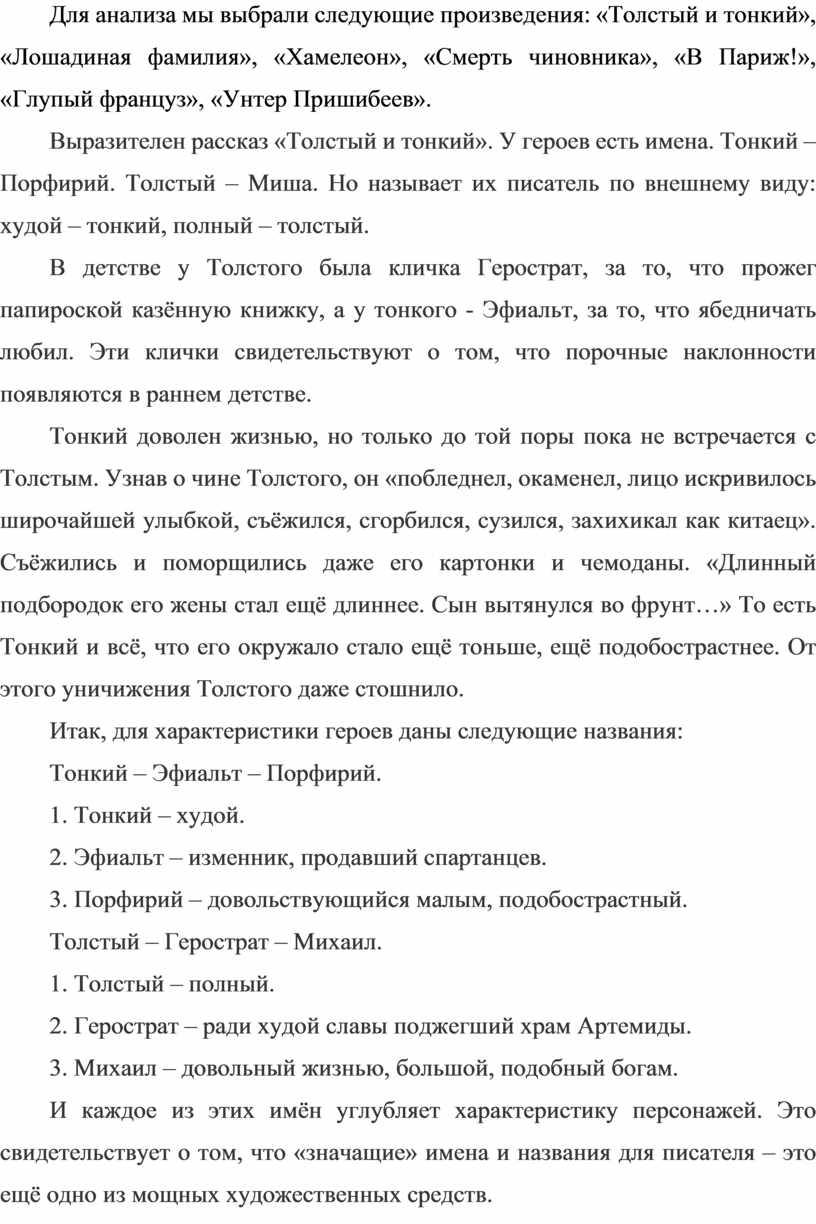 Для анализа мы выбрали следующие произведения: «Толстый и тонкий», «Лошадиная фамилия», «Хамелеон», «Смерть чиновника», «В Париж!», «Глупый француз», «Унтер Пришибеев».