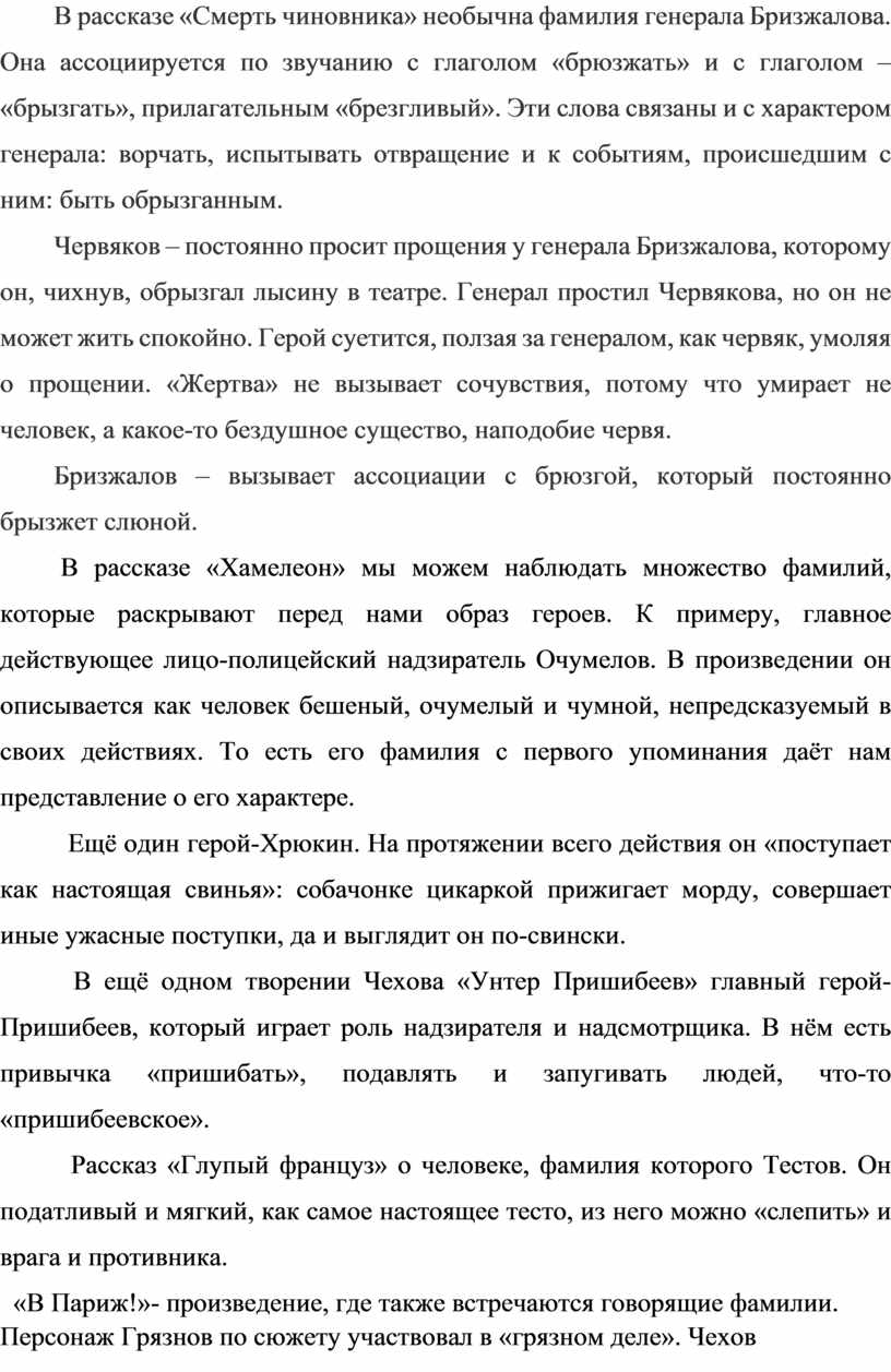 В рассказе «Смерть чиновника» необычна фамилия генерала Бризжалова. Она ассоциируется по звучанию с глаголом «брюзжать» и с глаголом – «брызгать», прилагательным «брезгливый». Эти слова связаны и с характером генерала: ворчать, испытывать отвращение и к событиям, происшедшим с ним: быть обрызганным.