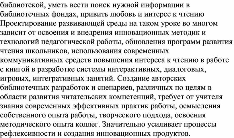 Проектирование развивающей среды на таком уроке во многом зависит от освоения и внедрения инновационных методик и технологий педагогической работы, обновления программ развития чтения школьников, использования современных коммуникативных средств повышения интереса к чтению в работе с книгой в разработке системы интерактивных, диалоговых, игровых, интегративных занятий. Создание авторских библиотечных разработок и сценариев, различных по целям в области развития читательских компетенций, требует от учителя знания современных эффективных практик работы, осмысления собственного опыта работы, творческого подхода, освоения методического опыта коллег. Значительно усиливает процессы рефлексивности и создания инновационных продуктов.