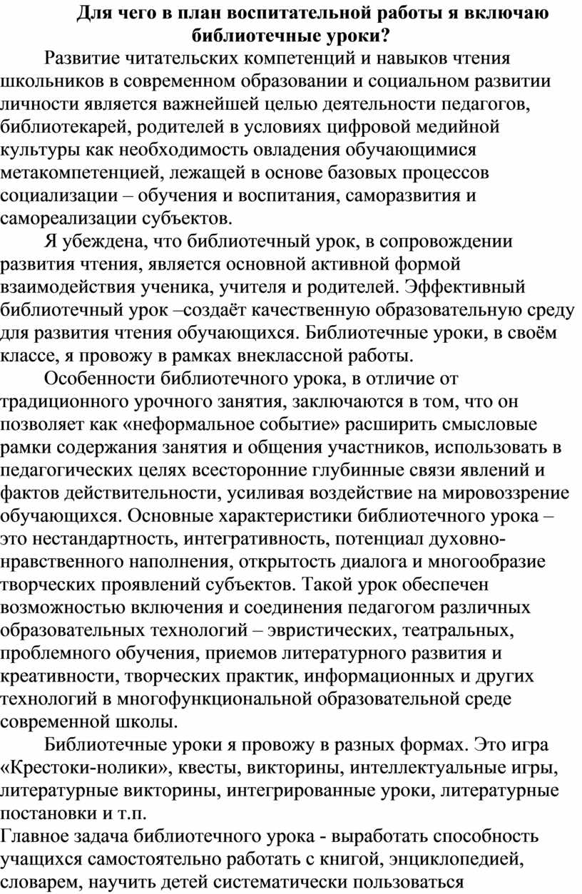 Для чего в план воспитательной работы я включаю библиотечные уроки?