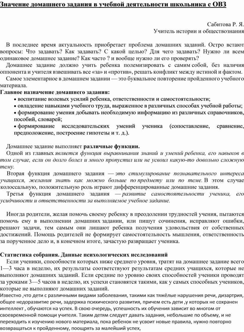 Значение домашнего задания в учебной деятельности школьника с ОВЗ