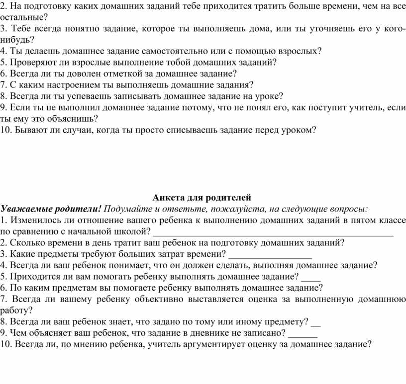 1. Изменилось ли отношение вашего ребенка к выполнению домашних заданий в пятом классе по сравнению с начальной школой? _________________________________________________
