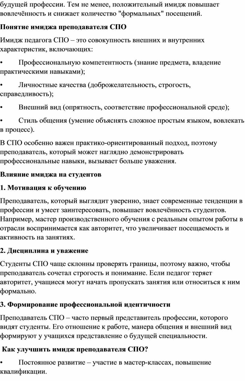Имидж преподавателя среднего профессионального образования (СПО) играет ключевую роль в формировании мотивации студентов, их отношении к профессии и успешности обучения. В отличие от вузов, в СПО больше внимания уделяется практическим навыкам, поэтому личность педагога становится важным связующим звеном между теорией и реальной профессиональной деятельностью. Он влияет на восприятие учителя учениками, коллегами и родителями, а также на эффективность педагогической деятельности. Грамотно сформированный образ помогает устанавливать доверительные отношения, повышать мотивацию учащихся и укреплять авторитет педагога.