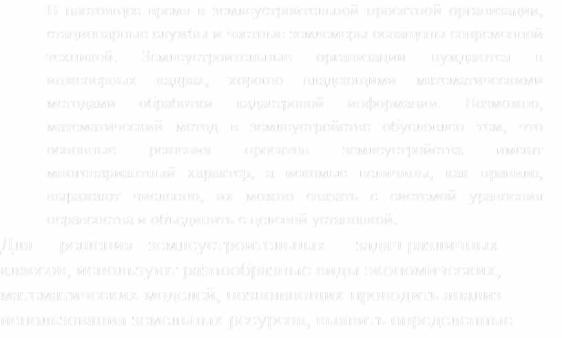 Для решения землеустроительных задач различных классов, используют разнообразные виды экономических, математических моделей, позволяющих проводить анализ использования земельных ресурсов, выявить определенные тенденции и находить оптимальные варианты устройства территории.