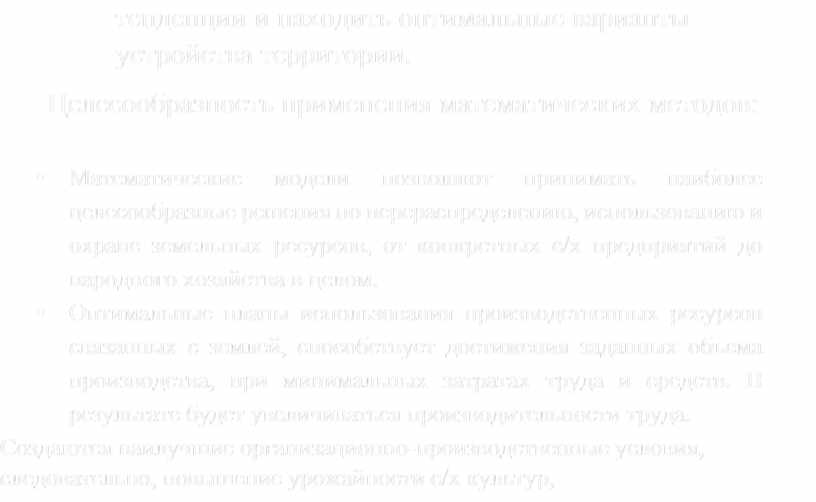 • Математические модели позволяют принимать наиболее целесообразные решения по перераспределению, использованию и охране земельных ресурсов, от конкретных с/х предприятий до народного хозяйства в целом.