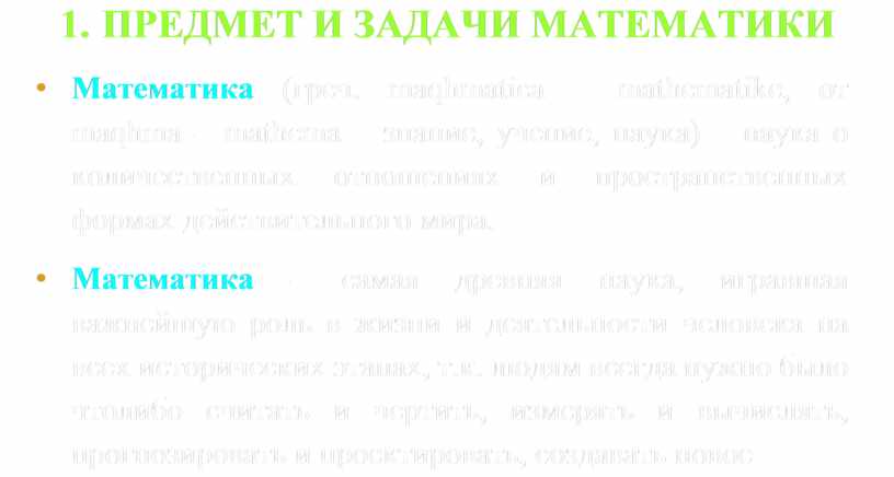 • Математика (греч. maqhmatica – mathematike, от maqhma – mathema – знание, учение, наука) – наука о количественных отношениях и пространственных формах действительного мира.