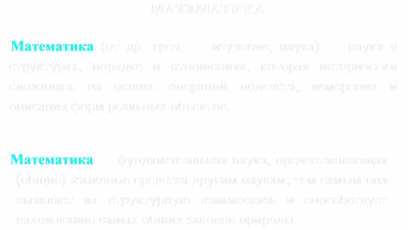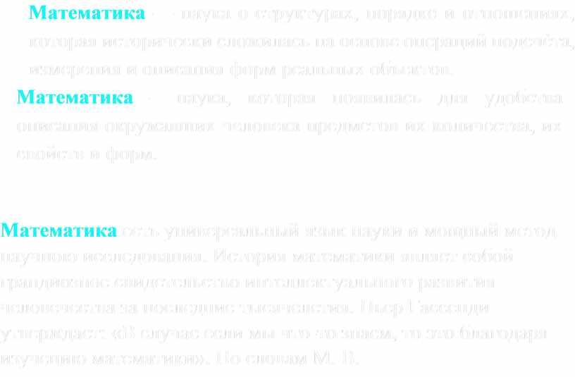 Математика — наука о структурах, порядке и отношениях, которая исторически сложилась на основе операций подсчѐта, измерения и описания форм реальных объектов.
