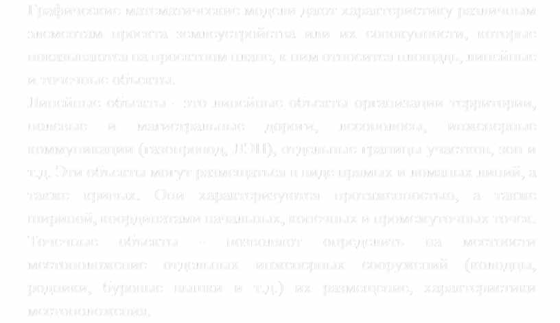 Графические математические модели дают характеристику различным элементам проекта землеустройства или их совокупности, которые показываются на проектном плане, к ним относится площадь, линейные и точечные объекты.