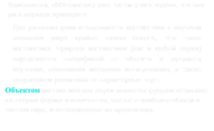 Математика есть универсальный язык науки и мощный метод научною исследования. История математики являет собой грандиозное свидетельство интеллектуального развития человечества за последние тысячелетия. Пьер Гассенди утверждает: «В случае если мы что-то знаем, то это благодаря изучению математики». По словам М. В. Ломоносова, «Математику уже -затем учить нужно, что она ум в порядок приводит»