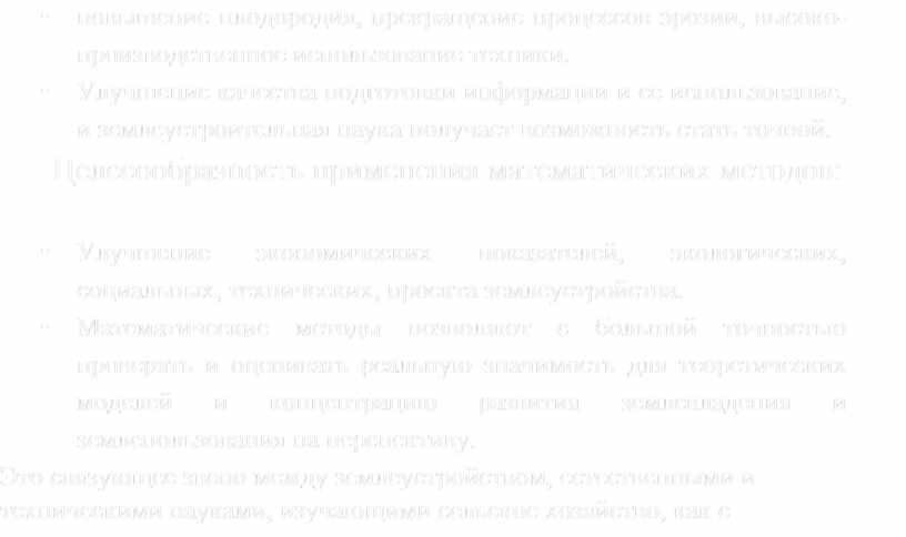 • Математические методы позволяют с большой точностью проверять и оценивать реальную значимость для теоретических моделей и концентрацию развития землевладения и землепользования на перспективу.