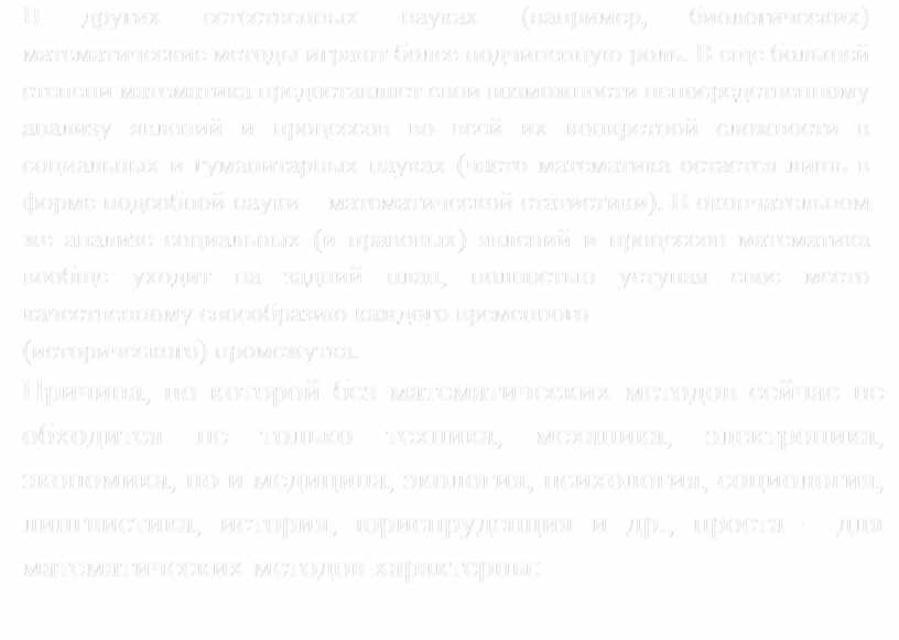 В других естественных науках (например, биологических) математические методы играют более подчиненную роль. В еще большей степени математика предоставляет свои возможности непосредственному анализу явлений и процессов во всей их конкретной сложности в социальных и гуманитарных науках (часто математика остается лишь в форме подсобной науки – математической статистики). В окончательном же анализе социальных (и правовых) явлений и процессов математика вообще уходит на задний план, полностью уступая свое место качественному своеобразию каждого временного