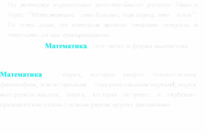 Математика – наука, которая скорее тождественна философии, чем остальным ―содержательным наукам‖; наука инструментальная; наука, которая вступает в глубокие органические связи с целым рядом других дисциплин