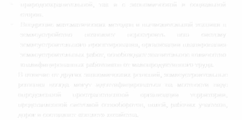 • Внедрение математических методов и вычислительной техники в землеустройство позволяет перестроить всю систему землеустроительного проектирования, организации планирования землеустроительных работ, освобождает значительное количество квалифицированных работников от малопродуктивного труда.